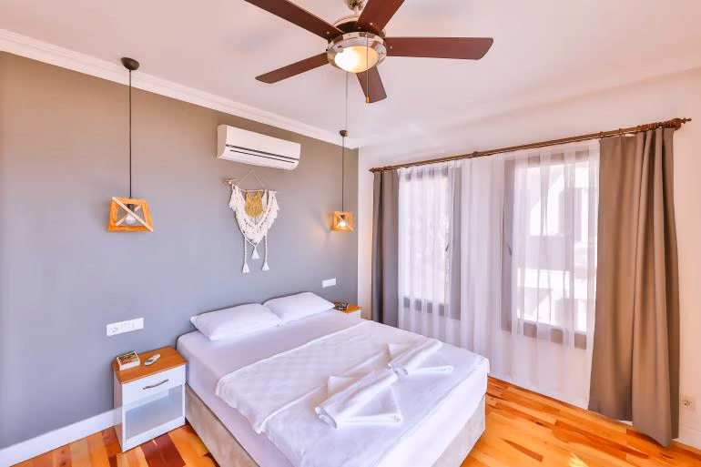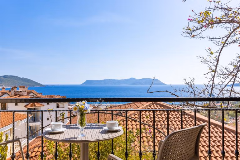 Our Deluxe Sea View Rooms are located on the 2nd and 3rd floors of our hotel. Our Deluxe Sea View Rooms have a private sitting area for our guests on their balconies with panoramic Mediterranean, Kas and Meis Island views. Our Deluxe Sea View Rooms are 18 m2 in size and offer accommodation with one large bed. Maximum accommodation capacity in our Deluxe Sea View Rooms is limited to 2 guests. Deluxe Sea View Rooms are equipped with tea and coffee station, hot water heater, mini fridge, hair dryer and air conditioning.
