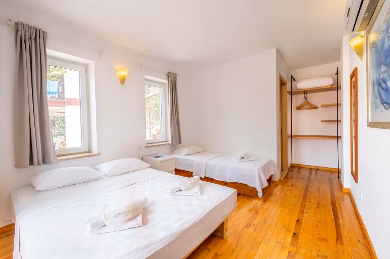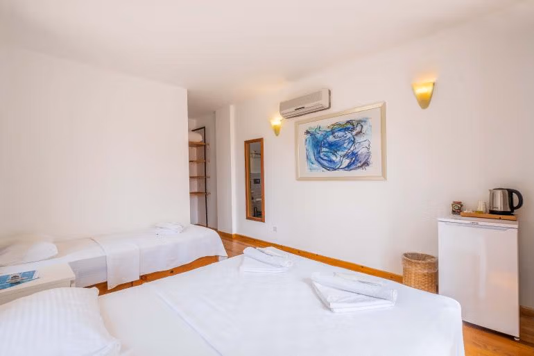 Our Standard Garden Floor Rooms are located on the garden floor of our hotel. The doors of these rooms open to sitting areas that our guests can use throughout the day. In the peaceful atmosphere of Kas, you can share good times with your family and collect memories in our carefully prepared garden area. Our Standard Garden Floor Rooms serve with a double bed and can host up to three guests with an additional bed in line with the needs. Our Standard Garden Floor Rooms have a tea/coffee station, hot water heater, mini fridge, hair dryer and air conditioning.